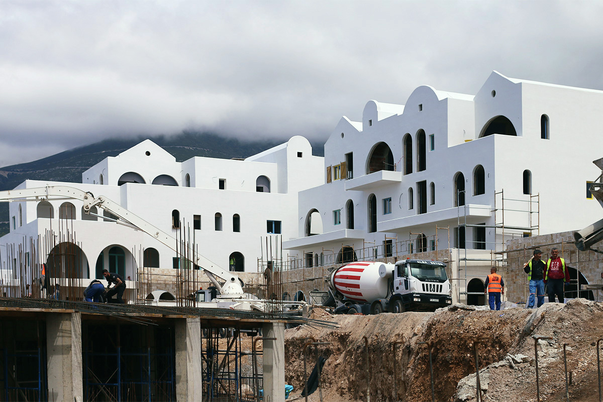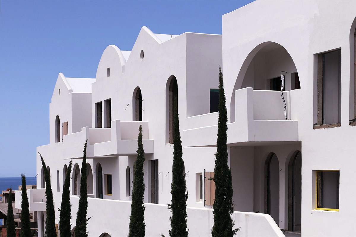 Located in Drymades beach, the holiday resort Drymadhë Villas is composed of a series of stepped courtyards framed by the architecture blending the project into a cohesive village feeling.
